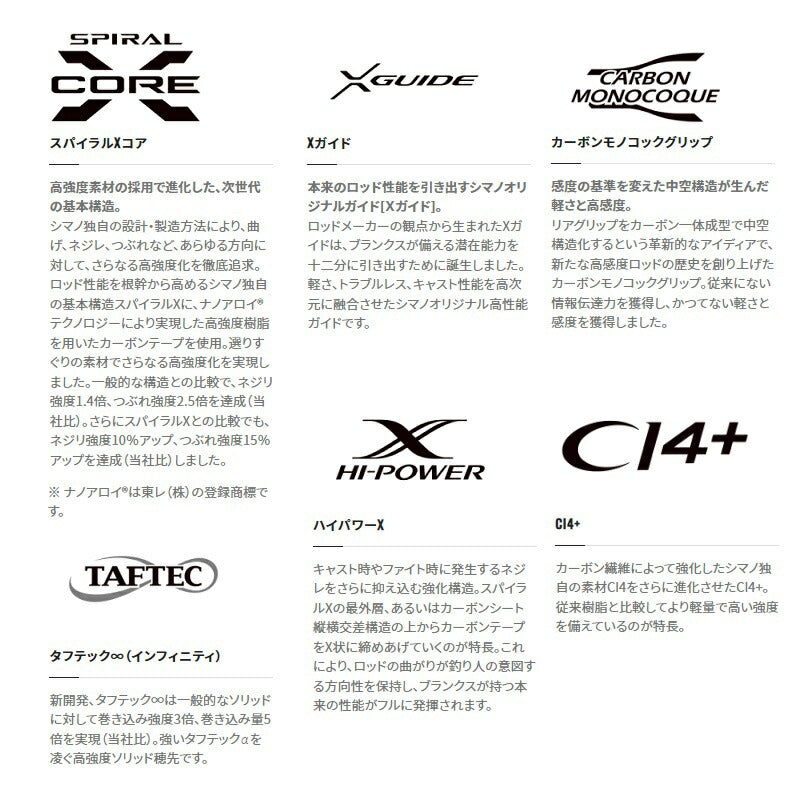 ロッド性能を根幹から高めるシマノ独自の基本構造スパイラルXに、ナノアロイテクノロジーにより実現した高強度樹脂を用いたカーボンテープを使用。