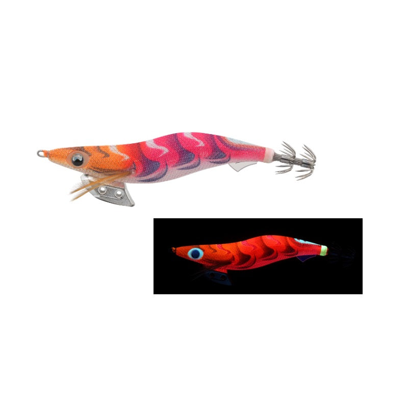 ローライトでも視認性が良く、ネオンブライトレッドがマヅメ時特有の赤い光を受けることにより、エギの存在を強調する。