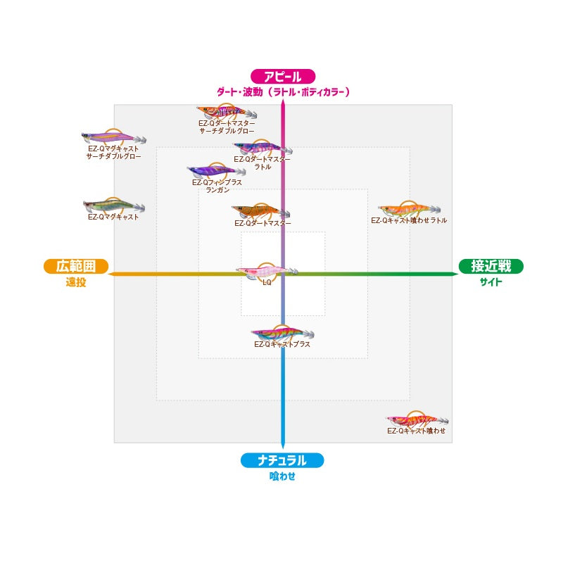 ※紫外線が届きにくい濁り潮の状況でも、ボディ本体のチャート系カラーがアピール効果を増加させイカをしっかり寄せます。