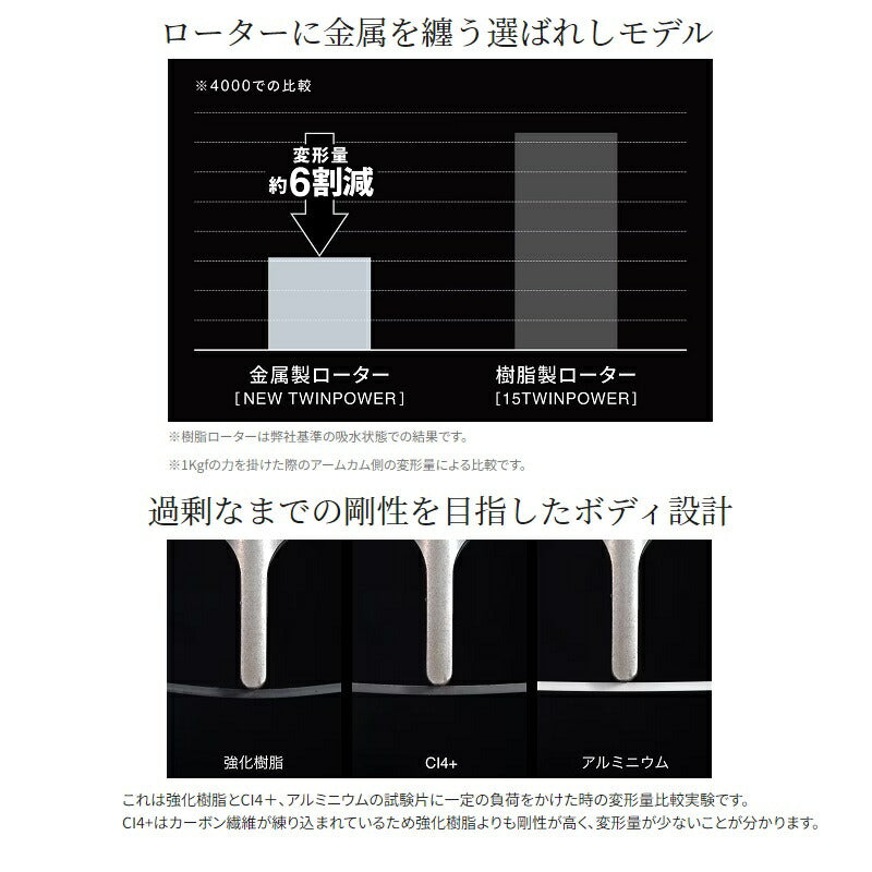 ツインパワーに採用しているCI4+は、樹脂に高強度なカーボン繊維が練り込まれ強化された構造になっています。