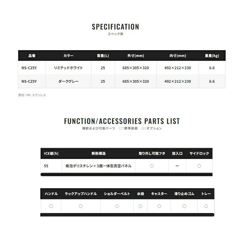 最大50cmの魚を曲げずにまっすぐ収納が可能。底面と側面に一体成型の真空パネルを配置することでI-CE値55hという高い保冷力を確保。
